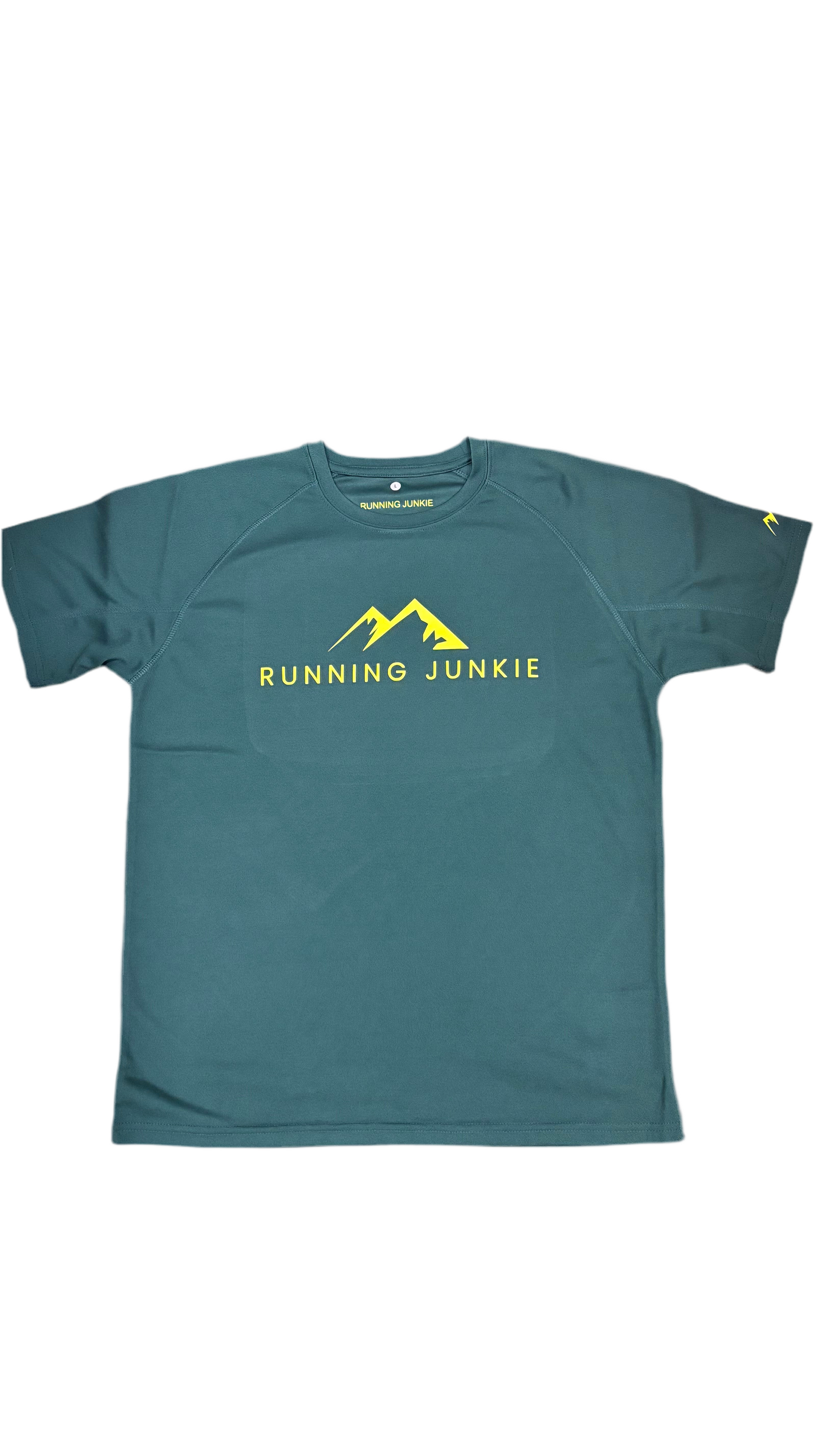 Men’s green active tee with yellow original logo, mountain on the sleeve and Death March Skull on the back of the left shoulder.